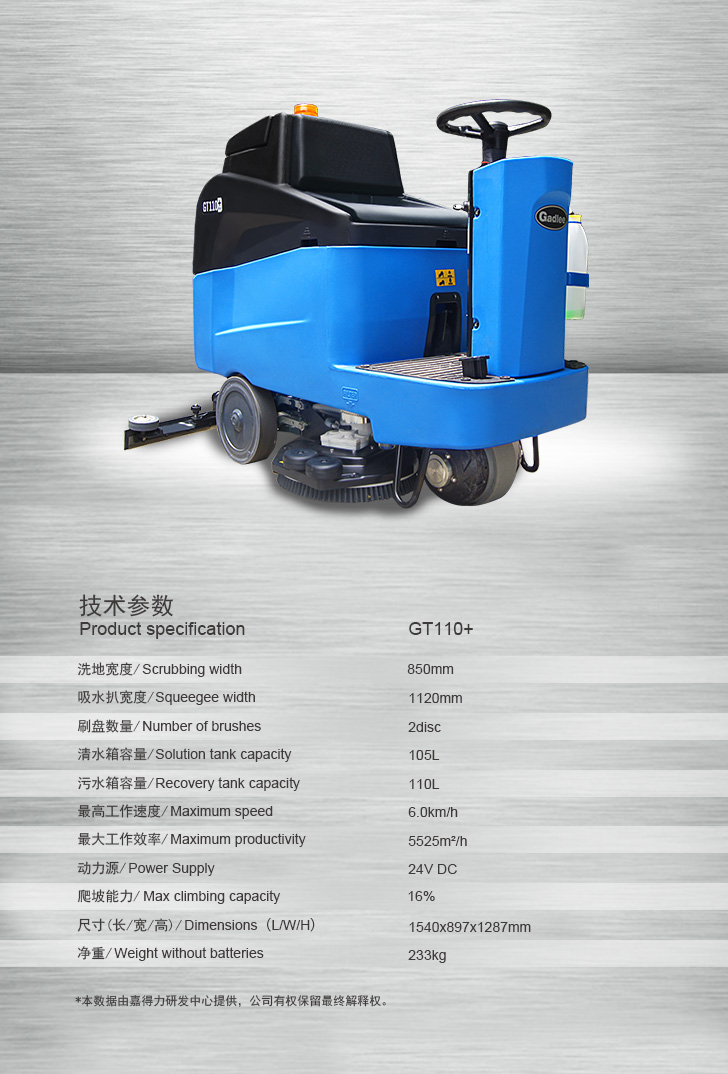 產品介紹: 全新的GT110+ 駕駛式洗地機為您帶來提升工作效率的所有元素,配備ECO系統及靜音設計令GT110+即時對噪音有嚴格要求的公共區域也能實現日間工作,標準配置EASE DOS清潔劑分配系統,使清潔劑和清水箱獨立運作,有效增強清洗效果和節省清潔劑的消耗量,有效完成醫院、學校、超市、商場、體育館、餐廳、酒店、輕工業生產車間等場所的地面清洗任務!
