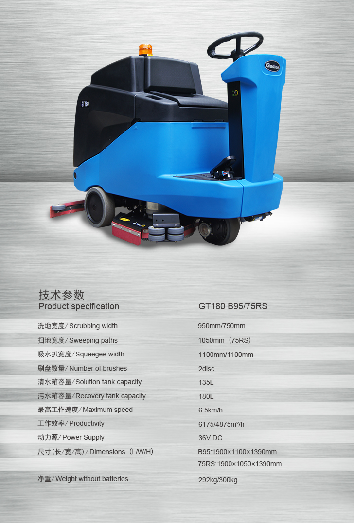 產品介紹: Gadlee GT180 駕駛式洗地機系列提供極高的穩定性及耐用性,適合各種類型的地面清洗任務。 能配合不同的刷子,百潔墊及其他附件,滿足不同類型的地面清洗需要。 GT180 系列專為大型商業地面清洗:例如購物中心,機場候機樓; 同樣也適合工業:例如大型物流倉庫、生產車間使用。 ● 2 個型號可供選擇:95cm (圓盤刷) 及 75cm(滾刷及清掃系統) ● 長效運行時間,運行時間高達6 小時 ● 一鍵式操控,內置3 個自動工作模式,滿足所有地面的清洗需要 ● 洗掃二合一系統,內置垃圾收集系統( 75RS 型號) ● 智能水量感應系統,充分保護刷盤及吸水系統 |