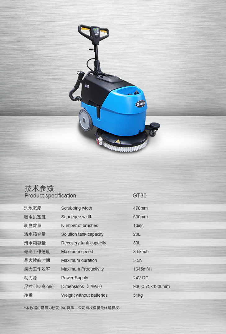 GT30手推式洗地機設計緊湊且操作靈活,卻能提供如大型洗地機般的清洗性能。配置可調式手柄,為清潔提供更多靈活性,同時兼顧較長的工作時間。 |