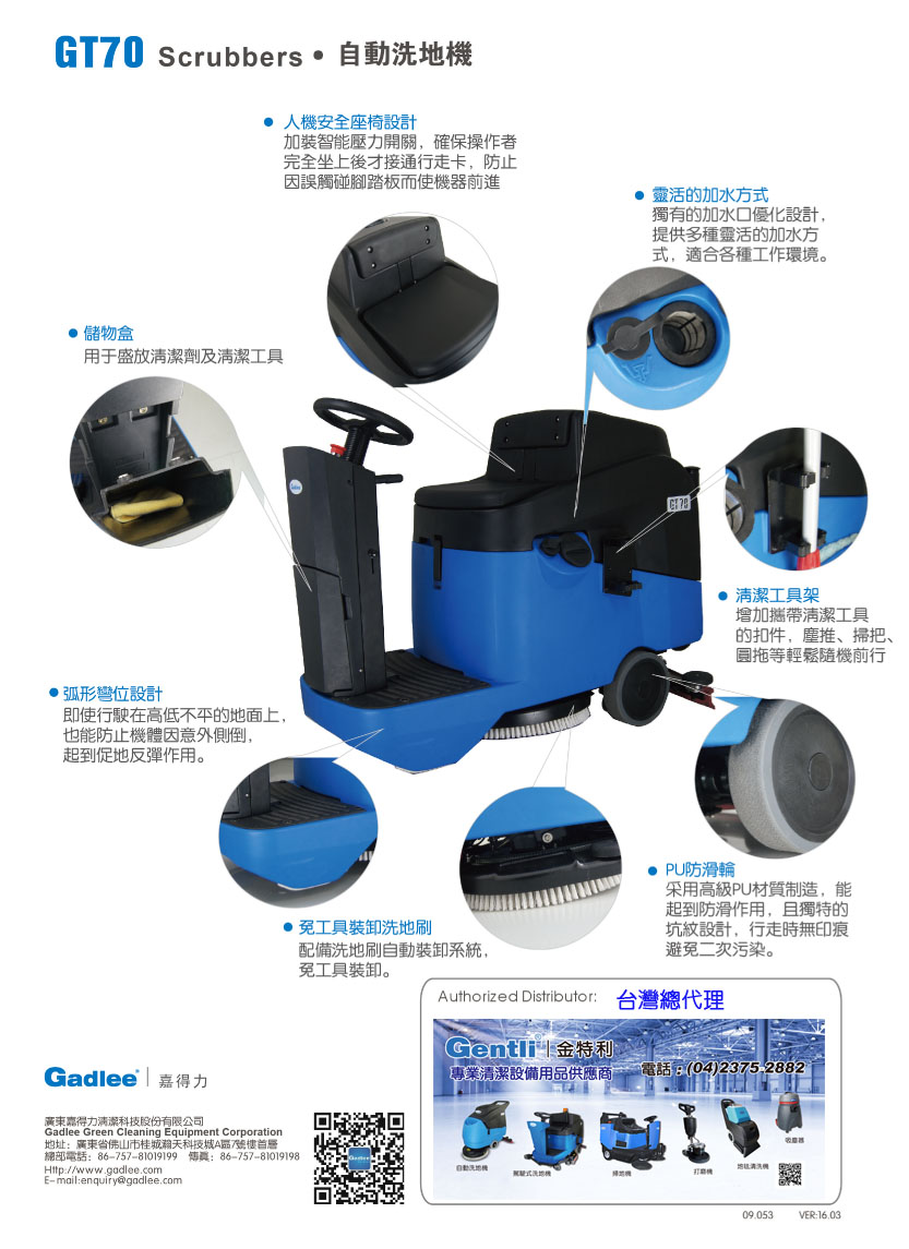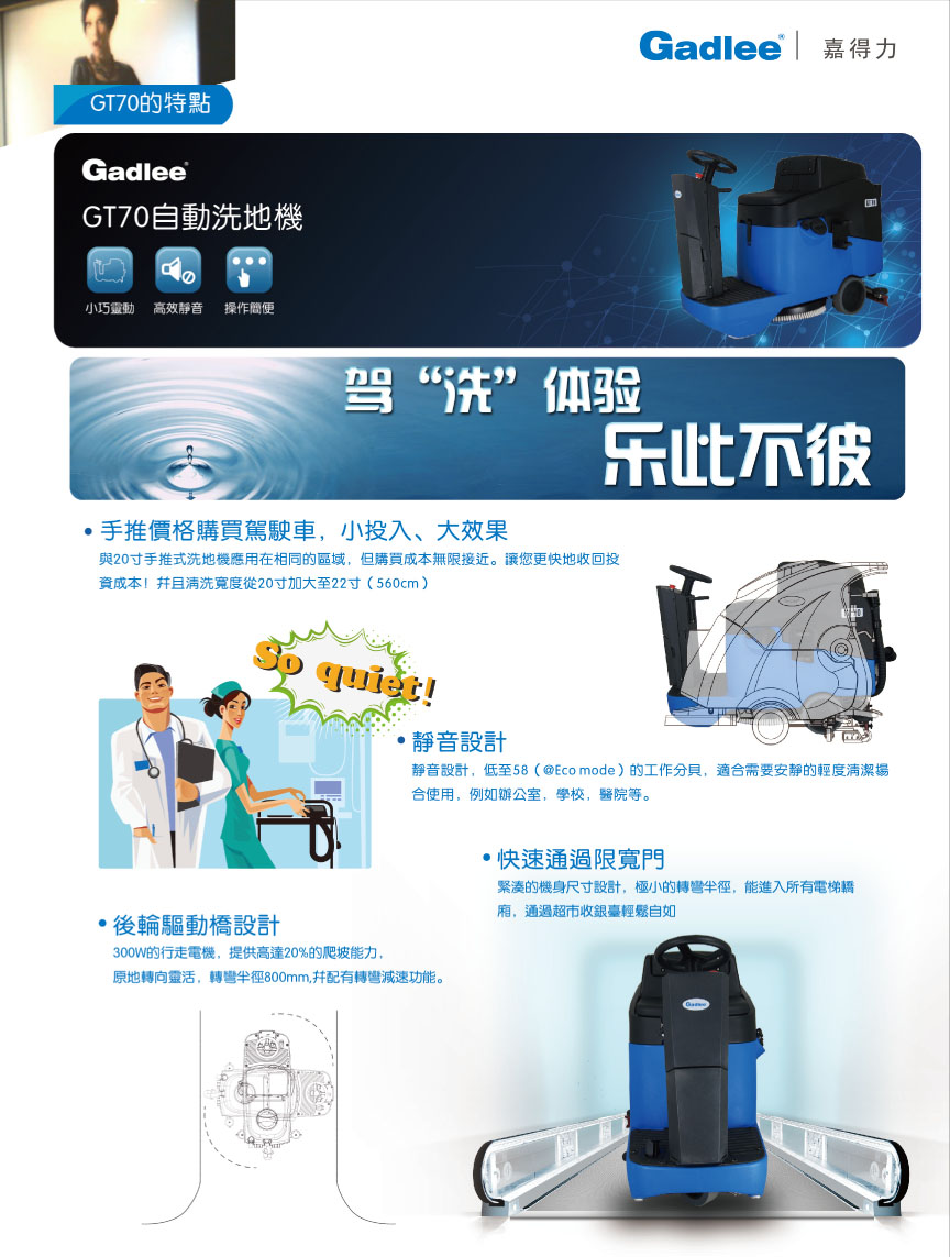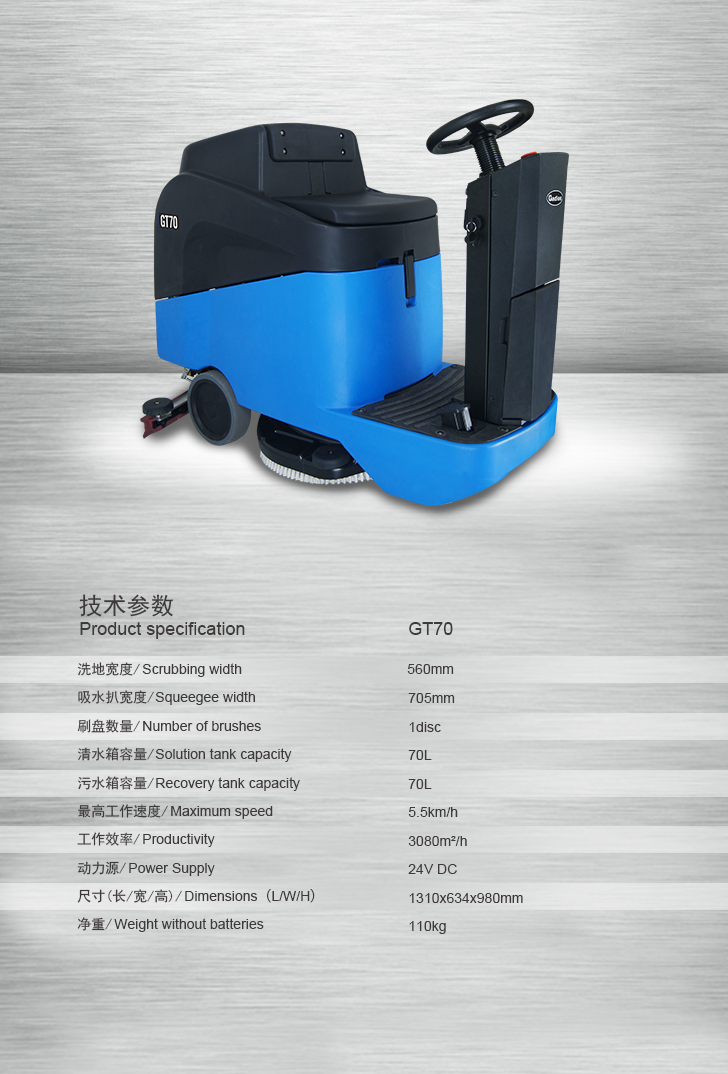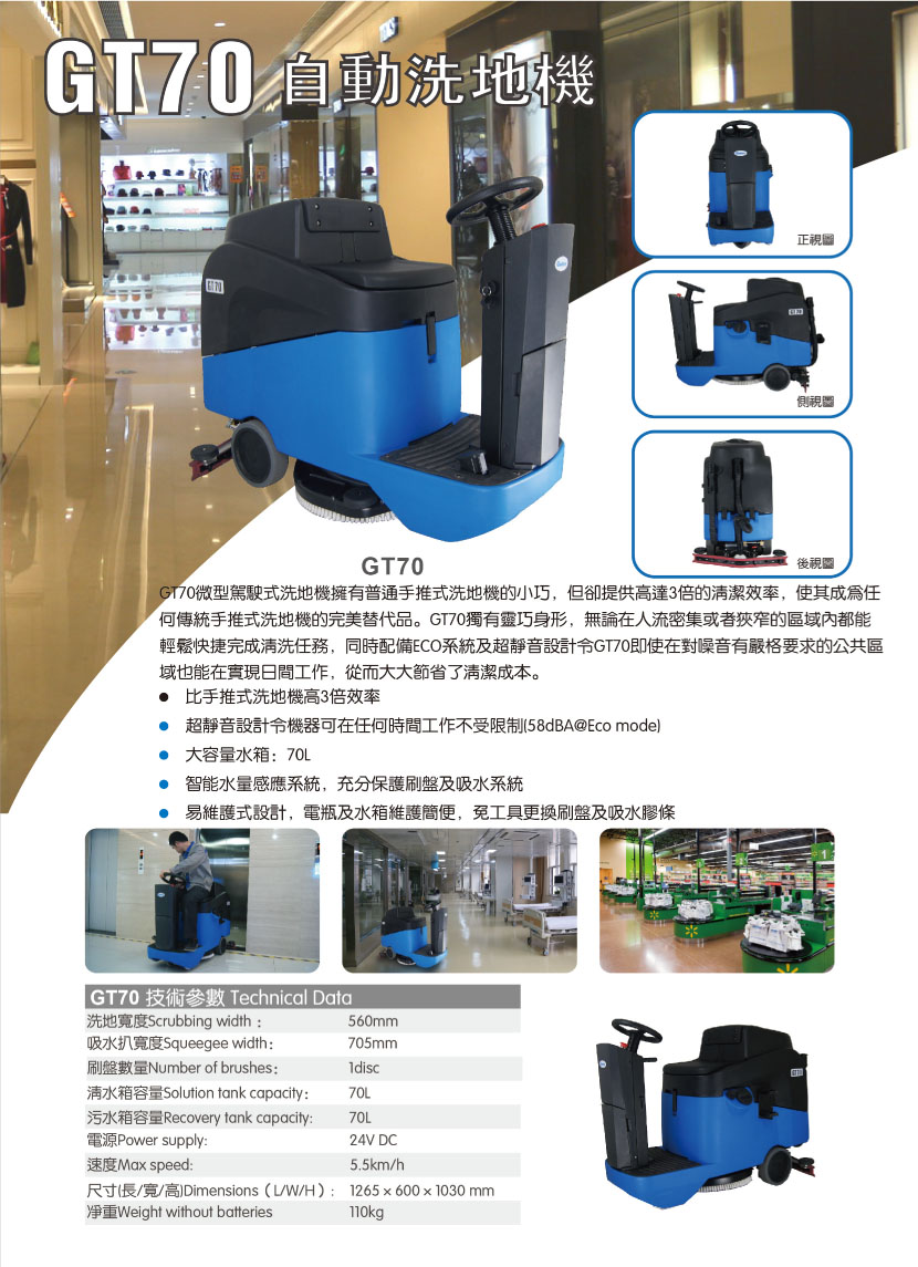 產品介紹: GT70微型駕駛式洗地機擁有普通手推式洗地機的小巧,但卻提供高達3倍的清潔效率,使其成為任何傳統手推式洗地機的完美替代品。 GT70獨有靈巧身形,無論在人流密集或者狹窄的區域內都能輕鬆快捷完成清洗任務,同時配備超靜音設計令GT70即使在對噪音有嚴格要求的公共區域也能在實現日間工作,從而大大節省了清潔成本。