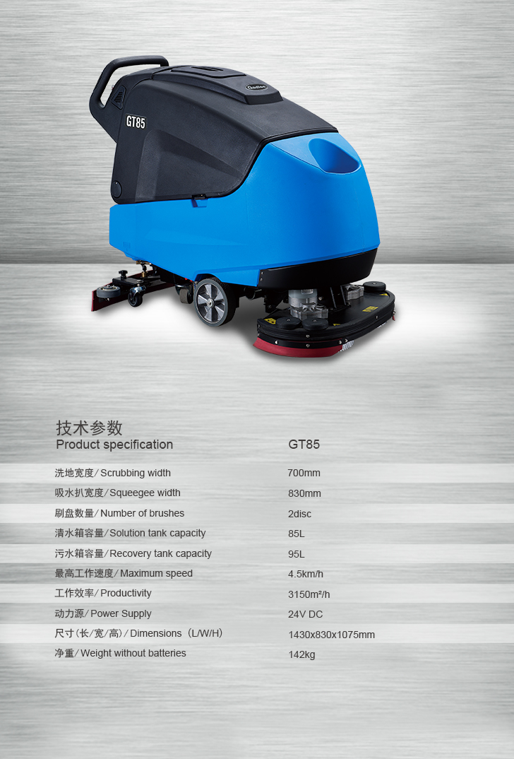產品介紹: Gadlee GT85中型手推式洗地機專為大中型的商業及工業地面清洗設計,提供70cm的清洗寬度及4.5km/h的工作速度, 大容量水箱確保機器提供高效的清潔。重工設計及優質的物料為機器提供更高的可靠性及長時間工作。 - 強力清洗刷盤,下壓力高達65kg - 一鍵操控及智能式控制台 - 前後自走驅動系統 - 智慧水量感應系統,充分保護刷盤及吸水系統 - 易維護式設計,電瓶及水箱維護簡便,免工具更換刷盤及吸水膠條 |