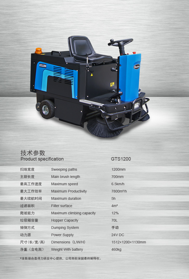 產品介紹: Gadlee GTS1200E是一款集外形緊湊、靈活、可靠於一體的專業級駕駛式掃地機,配備重工型過濾系統(PTFE)比傳統過濾系統提供高達6倍壽命,專為中型大面積的室內外清掃任務而設計,適用於如工業廠房、倉庫、停車場、月臺、廠區外道路、大型物流倉庫等等的地面清掃任務。
