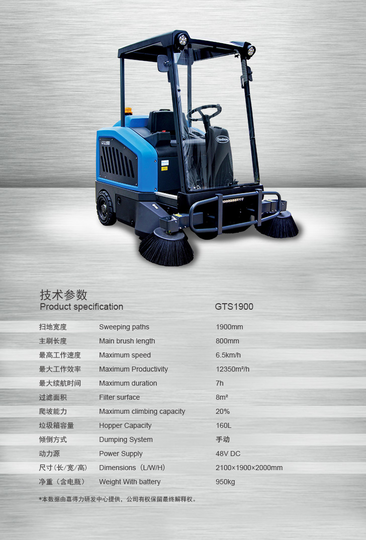產品介紹: Gadlee GTS1900E駕駛式掃地機為地面清掃提供解決方案,能同時應付微塵及有大塊的垃圾碎片的重工業環境,適合清掃所有的公共區域及大型物流區域,如物業小區倉庫、裝卸區及停車場等。GTS1900E掃地機集合所有專業掃地機的優點:大容量垃圾箱,動力強勁,傑出的清掃效果及非常卓越的控塵系統。 ● 續航時間達7小時 ● 工作效率高達12350m2/每小時 ● 爬坡能力達20% ● 配備8m2 PTFE重工型過濾系統,帶電動振塵系統 ● 4邊刷清掃系統 ● 全鋼底架配合高密度聚乙烯機身,結構堅固,有效避免故障源的發生和減少維護成本 |