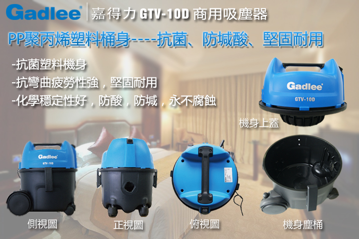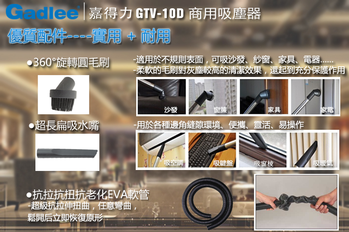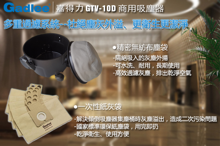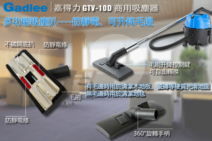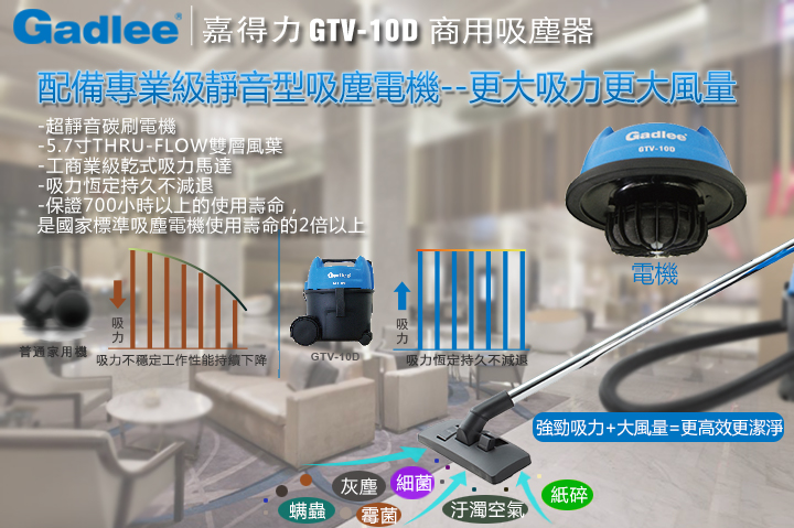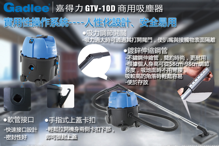 產品介紹: 嘉得力Gadlee GTV-10D超靜音商用吸塵器,專業耐用型吸塵機設計定位,是商業日常除塵清潔的得力武器,外型設計美觀且小巧靈活,堅固耐用,滿足更大區域及面積吸塵清潔的需求,廣泛適用於酒店、會所、餐廳、辦公室等商業環境。 嘉得力全方位深層清潔的GTV-10D吸塵器,為商用公眾場所提供環保潔淨抗菌的清潔解決方案,給企業和消費者創造衛生綠色環境。 ● 採用5.7寸直徑雙層風葉,工商業乾用式吸力,持久耐用 ● 人體工學設計,配備伸縮吸塵管,方便清潔衛生死角 ● 低噪音等級設計可實現安靜操作,適用於噪音敏感的環境 ● 機身配備工具存放插口,全機各部件免工具拆裝 |