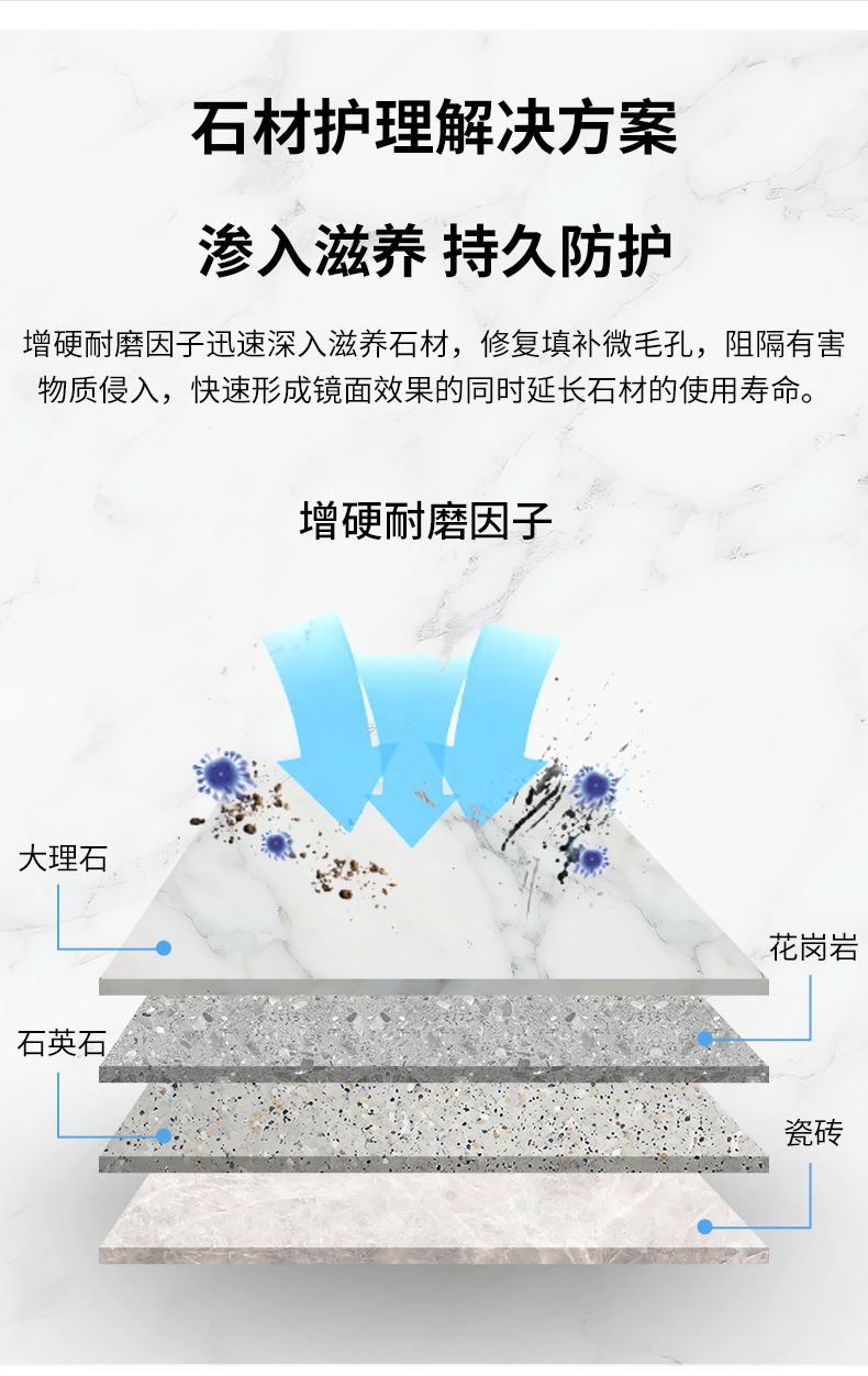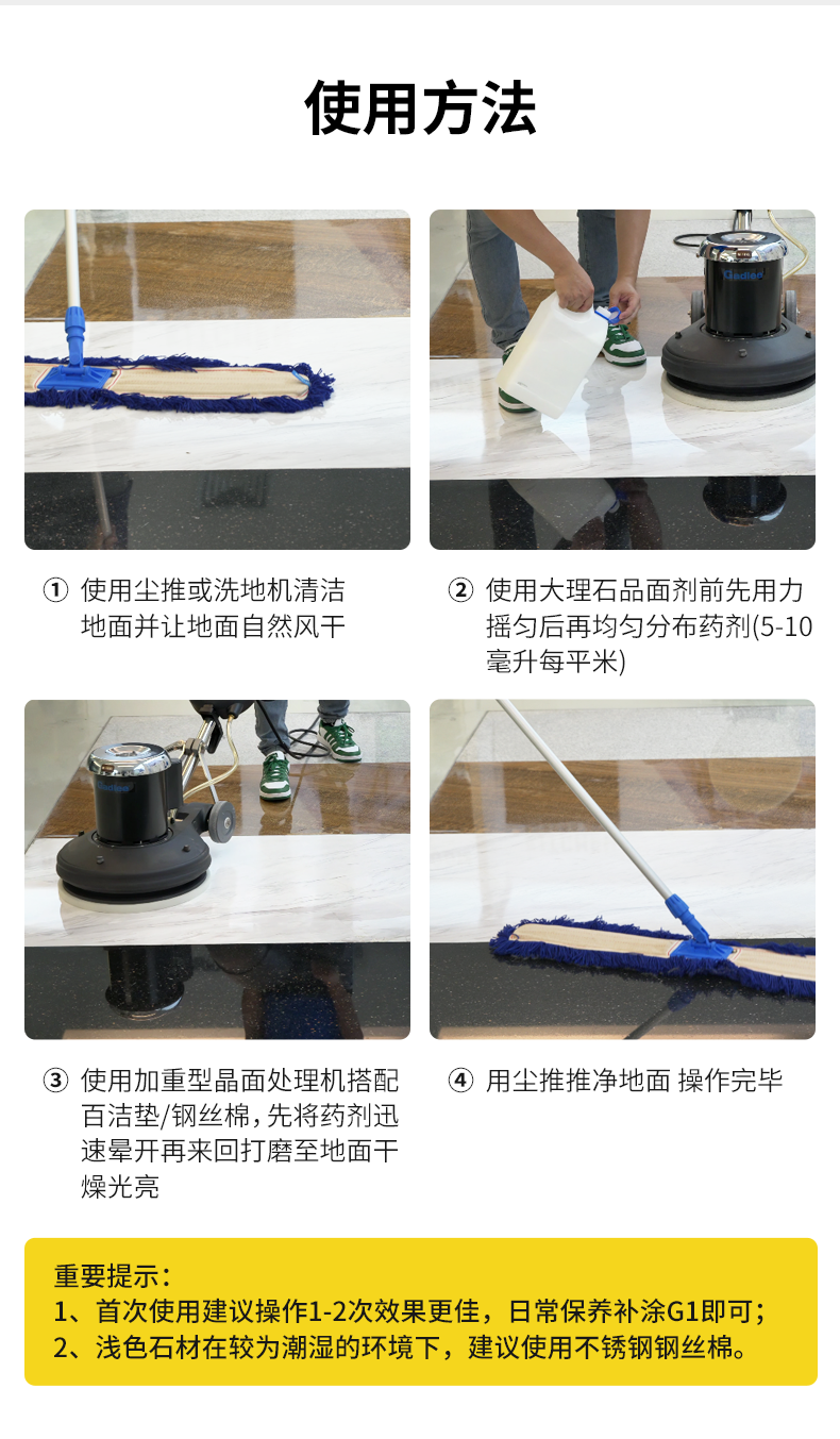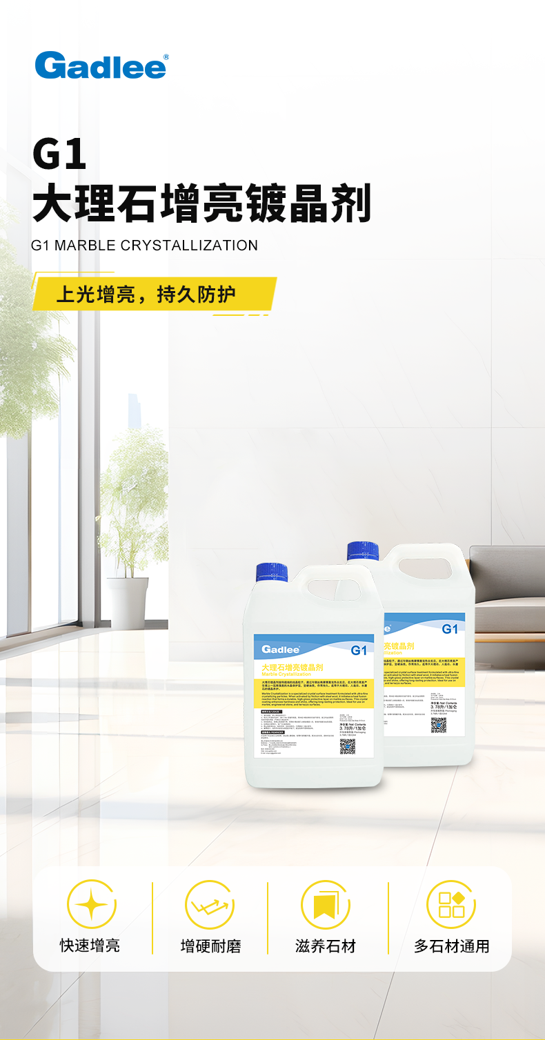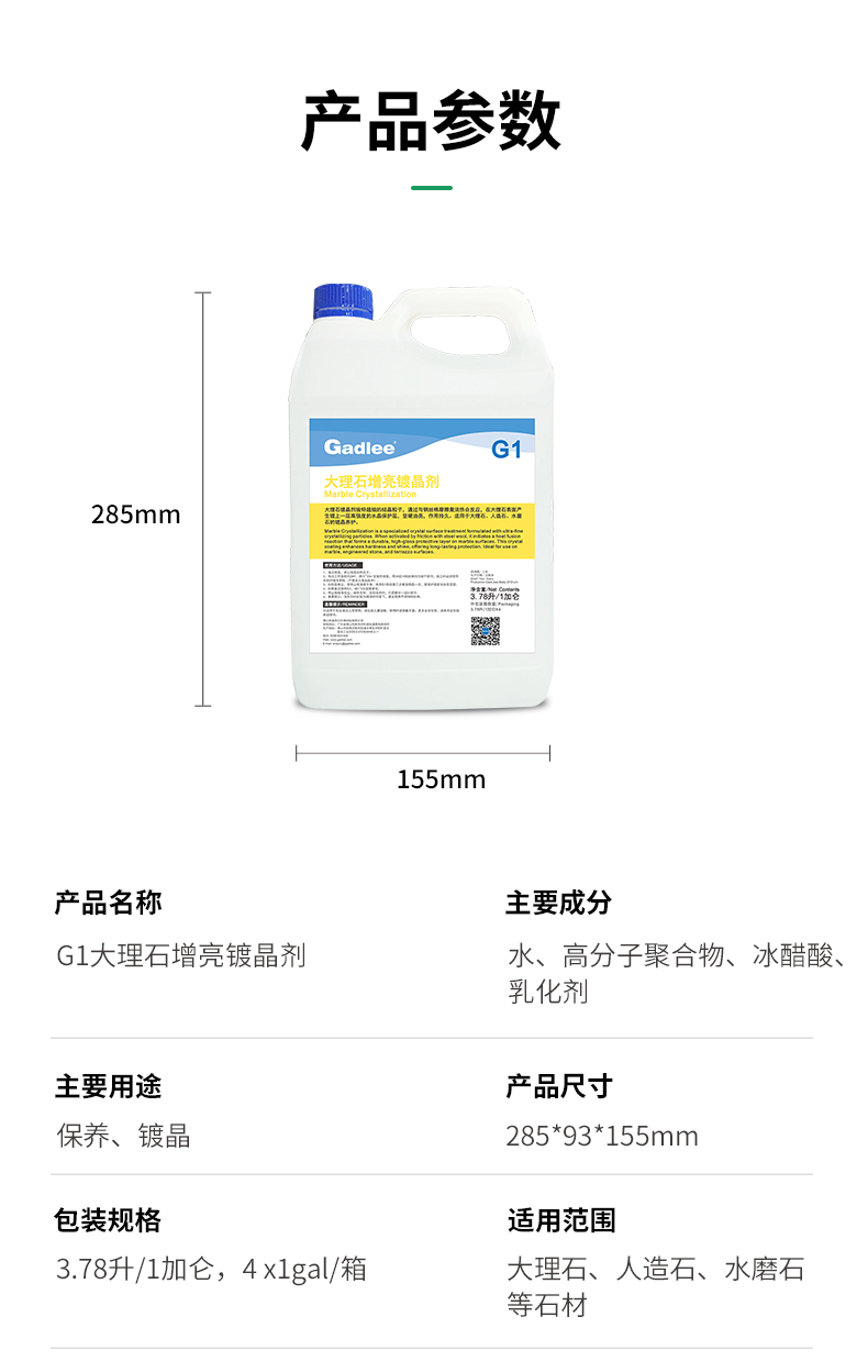 首頁 產品中心 石材藥劑及磨片系列 G1 大理石增亮鍍晶劑 205 G1 大理石增亮鍍晶劑 商品介紹: 大理石鍍晶劑獨特超細的結晶粒子,通過與鋼絲絨摩擦激活熱合反應,在大理石表面產生鍍上一層高強度的水晶保護層,堅硬油亮,作用持久。適用於大理石、人造石、磨石子的鍍晶養護。 1688523